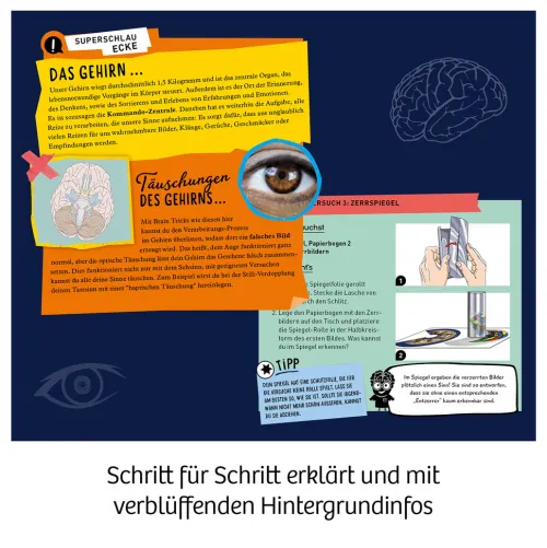 Verblüffende Illusionen und faszinierende Effekte am eigenen Körper erleben: Das Gehirn wird schneller in die Irre geführt, als man denkt! Vom Zerrspiegel über das faszinierende Sphericon bis zu selbst gestalteten 3D-Bildern – die Experimente geben kleine Rätsel auf und erstaunen mit optischen Täuschungen. Wie kann eine Figur zwei Gestalten gleichzeitig haben? Warum kann ich plötzlich die einfachsten Dinge nicht mehr malen? Die Brain Tricks begeistern nicht nur, sie machen neugierig auf MINT und Wissenschaft! Die Anleitung begleitet die einzelnen Versuche, erklärt die Gegenstände und bringt Licht ins Dunkel der Illusionen – dadurch begreift man, was die eigenen Augen kaum glauben wollen. Das KOSMOS Experimentierset erklärt Kindern zwischen 8 und 12 Jahren die Funktionsweise ihres Gehirns und lädt zu einer Achterbahnfahrt durch den eigenen Kopf ein! Eine Achterbahnfahrt für das Gehirn! Mit den Brain Tricks erleben Kinder verblüffende Illusionen und Effekte mit eigenen Augen. Von doppeldeutigen Figuren über selbst entworfene 3D-Bilder zum faszinierenden Sphericon – jedes Experiment ist gleichzeitig ein kleines Rätsel. Die aufregende Tour quer durch die Welt der optischen Täuschungen zeigt, wie unser Gehirn arbeitet. Dabei erklärt die Anleitung, was man seinen Augen eigentlich gar nicht glauben will! Am besten die Multi-Funktions-Brille direkt aufsetzen und durch verschiedene Experimente die verblüffende 3D-, Scharf- und Spektral-Sicht testen. Dieser KOSMOS Experimentierkasten ist wie Jogging fürs Gehirn für Kinder zwischen 8 und 12 Jahren, und fasziniert immer wieder aufs Neue!