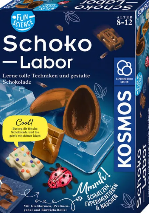 Ob weiße Schokolade, zartbitter oder vegan – hier verwandeln Kinder zwischen 8 und 12 Jahren ihre eigene Lieblingsschokolade in große und kleine Leckereien. Mit den Techniken der Profis lernen die Kinder, Schokolade im Wasserbad zu schmelzen und mit der Pralinengabel sicher umzugehen. Wie wäre es mit einem hohlen Schoko-Ei, das mit kleinen Überraschungen befüllt wird oder kleine Schokofiguren, die in Folie einschlagen zu süßen Geschenken werden? Warum schmilzt Schokolade? Und wie wird Schokolade zum Klebstoff? Die Anleitung führt durch die Experimente und vermittelt spannende Hintergrundinfos. Mit dem KOSMOS Schokoladen-Labor wird die süße Nascherei zum Kunstwerk und Lernobjekt – da macht das Genießen doppelt so viel Freude! Die Tore dieser kleinen Schokoladenfabrik stehen alle offen! Vom Schmelzen im Wasserbad über das Gießen neuer Formen bis zum Überziehen von Früchten mit Hilfe der Pralinengabel – diese Techniken testen Kinder direkt an ihrer eigenen Lieblingsschokolade! Ob weiß, zartbitter oder vegan – so ist das perfekte Ergebnis garantiert frisch, und der Spaß kann beliebig oft wiederholt werden. Wie wäre es zum Beispiel mit einem hohlen Schokoladen-Ei, das mit Süßigkeiten und Überraschungen gefüllt werden kann? Oder einem Marienkäfer und Rennwagen die erst verziert und dann in die knallrote Folie eingeschlagen werden? Toll zum Verschenken oder selbst Naschen!