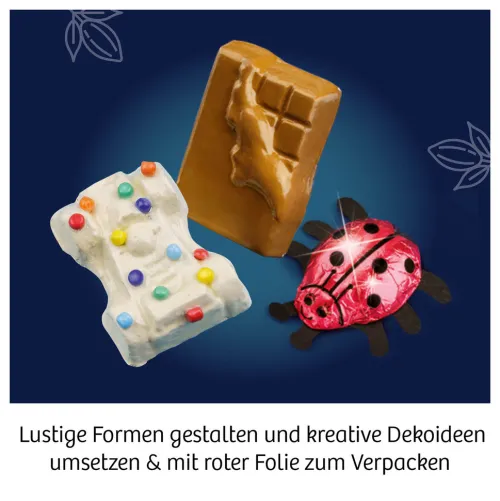 Von Schokoladenlollis bis zum hohlen Schoko-Ei mit viel Platz für kleine Überraschungen – hier verwandeln Kinder ihre eigene Lieblingsschokolade in neue Figuren und Formen!