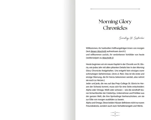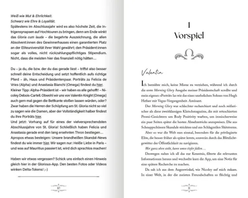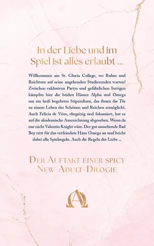 Willkommen am St. Gloria College, wo Ruhm und Reichtum auf seine angehenden Studierenden warten! Zwischen exklusiven Partys und gefährlichen Intrigen kämpfen hier die beiden Häuser Alpha und Omega um ein heiß begehrtes Stipendium, das ihnen die Tür zu einem Leben der Schönen und Reichen ermöglicht. Auch Felicia de Vries, ehrgeizig und fokussiert, hat es auf die akademische Auszeichnung abgesehen. Wenn da nur nicht Valentin Knight wäre. Der gut aussehende Bad Boy tritt für das verfeindete Haus Omega an und bricht dabei alle Spielregeln. Auch die Regeln der Liebe . . .