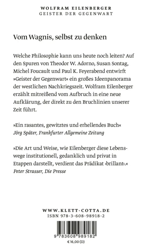 Welche Philosophie kann uns heute noch leiten? Auf den Spuren von Theodor W. Adorno, Susan Sontag, Michel Foucault und Paul K. Feyerabend entwirft »Geister der Gegenwart» ein großes Ideenpanorama der westlichen Nachkriegszeit. Wolfram Eilenberger erzählt mitreißend vom Aufbruch in eine neue Aufklärung, der direkt zu den Bruchlinien unserer Zeit führt.