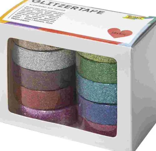 Set aus 10 Glitzertapes aus selbstklebendem Papier, je Rolle 15mmx5m, je 1 Rolle gold, silber, rotbraun, hochrot, pink, hellgrün, dunkelgrün, pazifikblau, dunkelblau, rosa, 10 Rollen verpackt in einer 4-farbig bedruckten Faltschachtel mit Sichtfenster, besonders