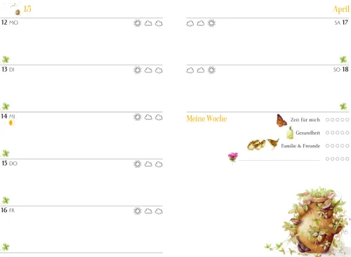 Dieser hochwertige GlücksKalender ist mehr als nur ein Wochenplaner – hier können die schönen Erlebnisse des Alltags festgehalten werden und einzigartige Illustrationen der Künstlerin Marjolein Bastin begleiten durch das ganze Jahr. Auf einer liebevoll gestalteten Doppelseite pro Woche finden neben den Terminen auch noch die aktuelle Stimmung und der Glücksmoment des Tages Platz. Das Kalendarium wird durch Feiertage, Mondphasen und Sternzeichen ergänzt und machen diesen GlücksKalender zum perfekten Begleiter für das Jahr 2027.
