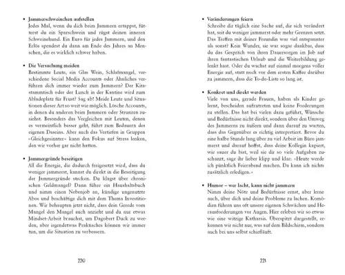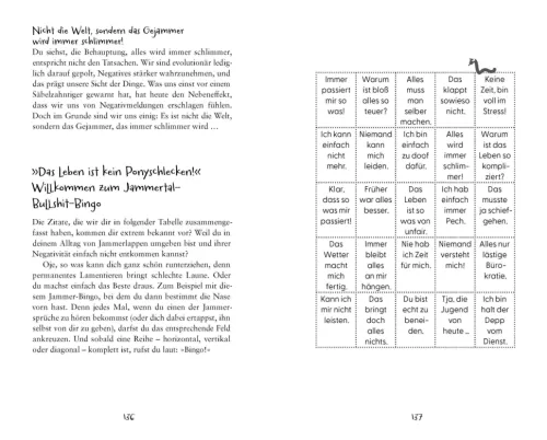 Mit Humor, psychologischem Tiefgang und vielen praktischen Tipps eröffnen die Autorinnen neue Perspektiven sowohl für frustrierte Jammerer als auch für alle, die keine Lust mehr haben, sich endloses Gejammer anzuhören.