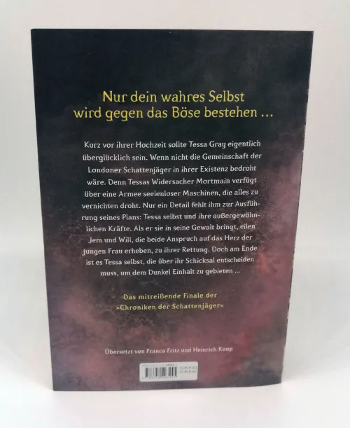 Kurz vor ihrer Hochzeit sollte Tessa Gray eigentlich überglücklich sein. Wenn nicht die Gemeinschaft der Londoner Schattenjäger in ihrer Existenz bedroht wäre. Denn Tessas Widersacher Mortmain verfügt über eine Armee seelenloser Maschinen, die alles zu vernichten droht. Nur ein Detail fehlt ihm zur Ausführung seines Plans: Tessa selbst und ihre außergewöhnlichen Kräfte. Als er sie in seine Gewalt bringt, eilen Jem und Will, die beide Anspruch auf das Herz der jungen Frau erheben, zu ihrer Rettung. Doch am Ende ist es Tessa selbst, die über ihr Schicksal entscheiden muss, um dem Dunkel Einhalt zu gebieten . . .