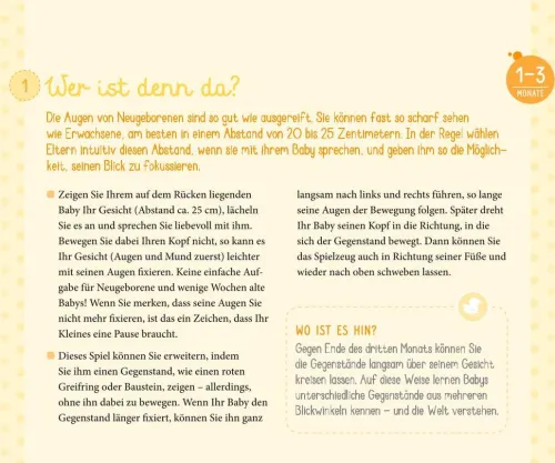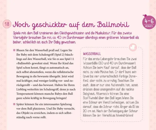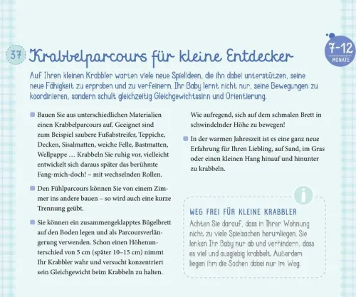 Nie wieder entwickelt sich ein Baby so rasant wie im ersten Lebensjahr! Mit PEKiP, dem Prager-Eltern-Kind-Programm, können Eltern diese Entwicklung ihres Babys optimal unterstützen und eine gute und sichere Bindung aufbauen. Dieser wunderschöne gestaltete Aufsteller versammelt dazu die 50 schönsten PEKiP-Spiele und -Anregungen, klar beschrieben, mit einem Farbfoto illustriert und Dank des praktischen Formates während der Spielzeit immer im Blick. Die Bewegungs-, Sinnes- und Spielanregungen begleiten die Entwicklung Ihres Kindes dem individuellen Entwicklungsstand entsprechend: 0-3 Monate; 4-6 Monate; 7-12 Monate. So können Eltern mit ihrem Baby eine wunderschöne gemeinsame Spielzeit genießen und gleichzeitig seine Fähigkeiten gezielt fördern.