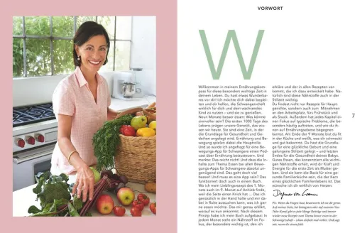 Im Kochbuch werden die einzelnen Schwangerschaftsmonate genau dargestellt – immer mit einer Übersicht, welche Nährstoffe jetzt besonders wichtig sind. Es folgen Rezepte für Smoothies und Säfte, frische Salate, Rohkost sowie warme Mahlzeiten. Immer mit dem Hinblick auf die optimale Nährstoffversorgung.