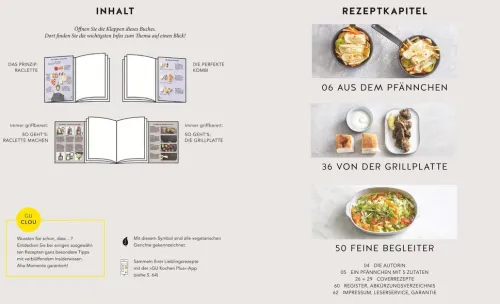 Auf den Buchklappen zeigen Ihnen Schritt-für-Schritt-Anleitungen was Sie im Umgang mit Pfännchen und Grillplatte beachten müssen ausgeklappt immer im Blick. Infos zum richtigen Zubehör und den passenden Käsesorten runden den GU Küchenratgeber ab.
