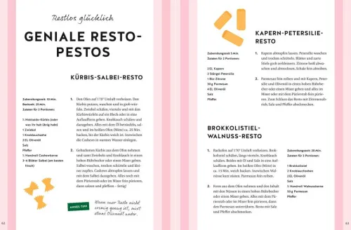 Als kleines Küchen-Extra gibt es Grundsaucen und Abwandlungen, Buttermischungen fürs Grillen, Salatdressings und Marinaden für Salate, Aufstriche und Dips für den Brunch, Resteverwertung durch Pestos für Pasta-Gerichte und dazu zahlreiche Küchenhacks und Praxis-Tipps. Dank der besonderen Profi-Hacks, die nicht nur das Kochen einfacher machen, sondern auch kurzweiligen Lesespaß bieten, erhalten die Gerichte einen zusätzlichen Aroma-Booster oder persönliche Anmerkungen der Autorin, wie du noch mehr Zeit beim Zubereiten sparen kannst.