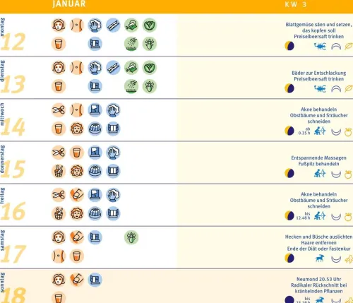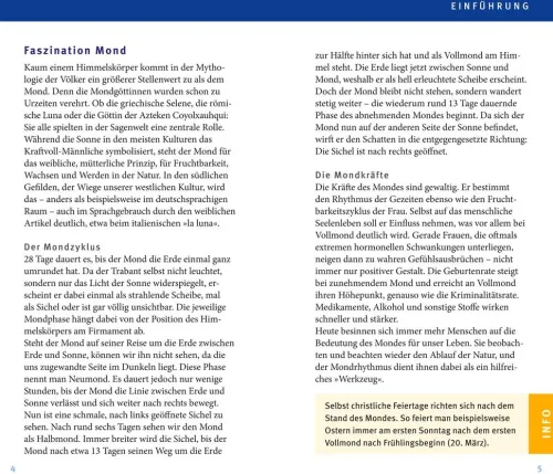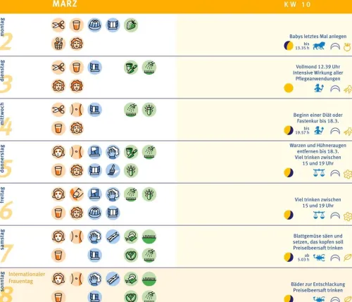 Als täglicher Begleiter bietet er auf einer Doppelseite pro Woche genügend Platz für eigene Notizen und liefert durch die farbigen Symbole rasch die gewünschten Informationen. Für den schnellen Zugriff gibt es am Ende des Kalenders eine praktische Einmerk-Klappe, auf der noch einmal alle Symbole erklärt werden. Bleiben dennoch wichtige Fragen rund um den Mondkalender offen, hilft die Telefon-Hotline kompetent weiter.