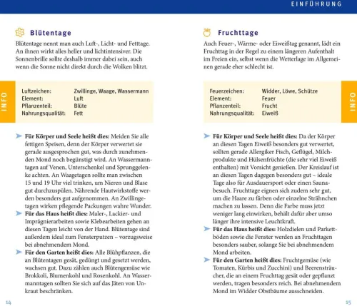 Welcher Tag ist perfekt zum Haare schneiden? Oder wann ist der Start einer Abnehmkur am erfolgreichsten? Der handliche Taschenkalender von Andrea Lutzenberger enthält über 30 Symbole, die Ihnen auf einem Blick verraten, wann die besten Zeitpunkte sind, um „Körper & Seele“ zu verwöhnen oder Arbeiten im „Haushalt“ und „Garten“ zu erledigen.