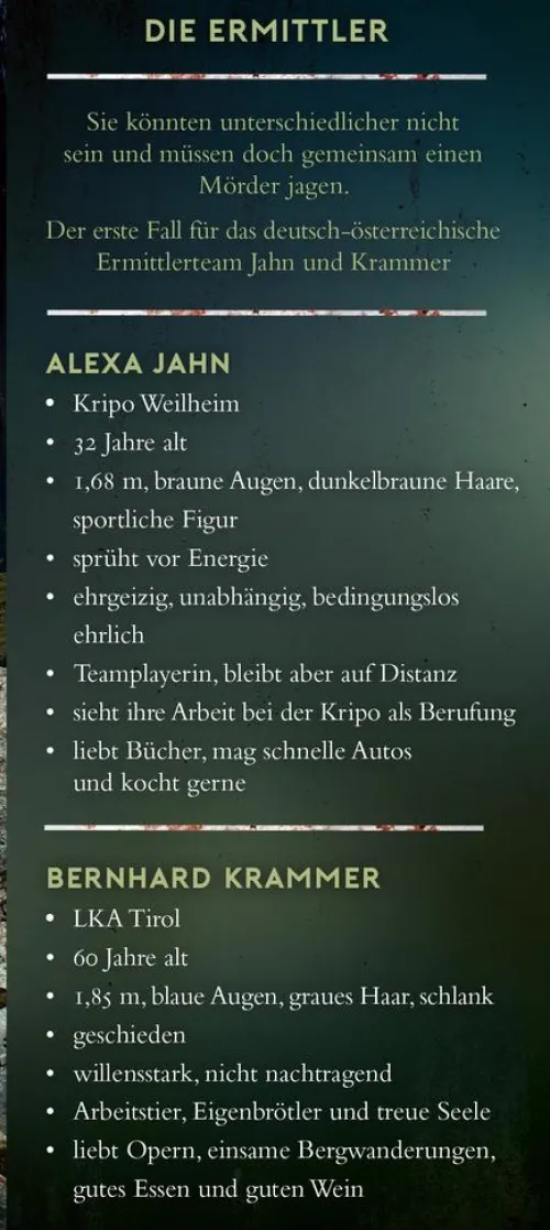 Für die junge und engagierte Oberkommissarin Alexa Jahn, die gerade ihren Dienst bei der Kripo Weilheim angetreten hat, ist es die erste große Ermittlung. Sie könnte jede Unterstützung gebrauchen, doch auf den desillusionierten Kollegen auf österreichischer Seite, Chefinspektor Bernhard Krammer, kann sie nicht zählen.