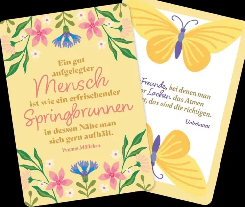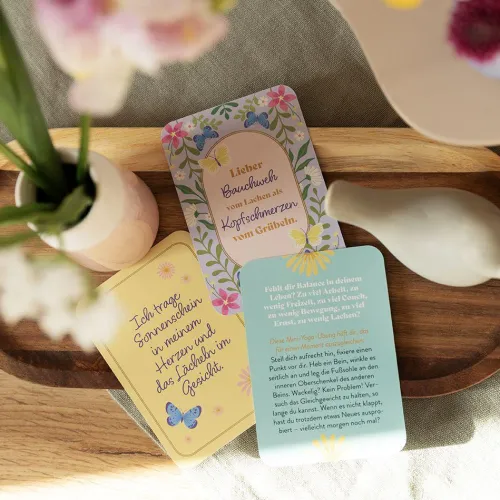 Gute Laune ist ansteckend und lässt uns beschwingt durchs Leben tanzen. Denn wer lächelt, tut nicht nur seiner Haltung, sondern auch seinem Herzen etwas Gutes. Entdecke jeden Tag ein kleines Stück vom Glück mit diesen inspirierenden Karten! Die hochwertige Kartenbox im handlichen Format mit 50 Impulsen, Zitaten und Anregungen sorgt für mehr Lebensfreude im Alltag – immer und überall!