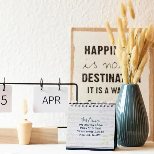 Der kleine Aufsteller „Ein Ziel ist ein Traum mit Termin“ liefert mit positiven Sprüchen und Zitaten den Extra-Kick Motivation – das perfekte Geschenk für jeden Neuanfang! Denn: „Der Unterschied zwischen dem, was du bist, und dem, was du sein willst, ist das, was du tust.“