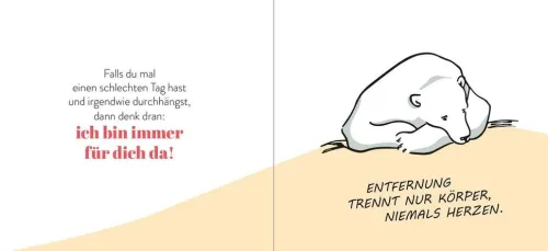 Mach einem Lieblingsmenschen eine Freude und lass ihn mit diesem Minibuch wissen, dass du an ihn denkst, ihn vermisst und dich freust, ihn bald wieder zu umarmen. Die witzigen Tierillustrationen, die liebevollen Texte, die Sprüche und Zitate zaubern dem Beschenkten garantiert ein Lächeln aufs Gesicht. Lass niedliche Eisbären für dich sprechen und lass deinen Freund oder deine beste Freundin, deine Schwester oder deine Tochter wissen: „Entfernung trennt nur Körper, niemals Herzen“.