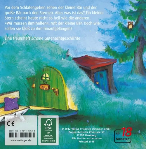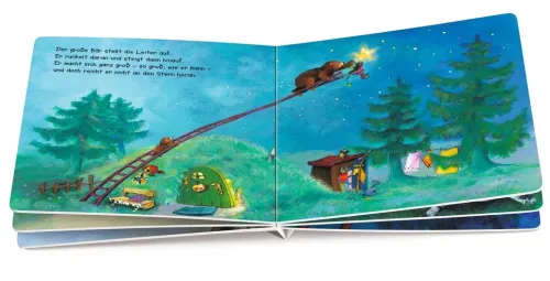 Vor dem Zubettgehen sehen der kleine Bär und der große Bär noch einmal nach den Sternen. Doch ein kleiner Stern scheint heute nicht so hell wie die anderen. Sofort suchen die Bären nach einer Möglichkeit, ihm zu helfen. Mit der Leiter klettern sie zu dem kleinen Stern hinauf und setzen ihm eine Mütze auf. Jetzt geht es dem kleinen Stern bestimmt bald wieder besser und der kleine Bär kann ganz beruhigt einschlafen.
