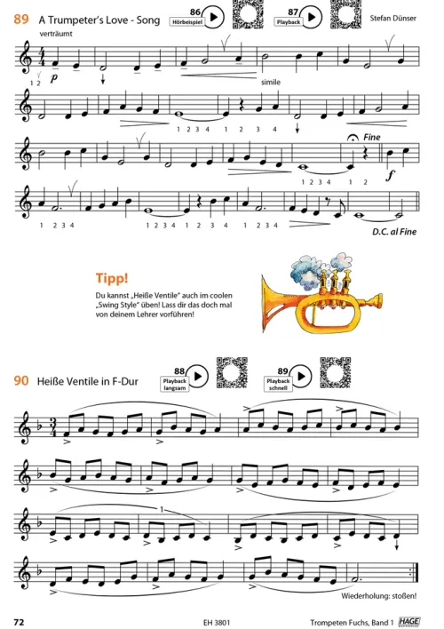 Spielerisch und mit Begeisterung erlernen die Anfänger Schritt für Schritt das Trompetenspiel. Viele neue, aber auch bewährte methodische Wege sind in diese Schule eingearbeitet. Der Trompeten Fuchs gehört mittlerweile zu den erfolgreichsten Trompetenschulen der letzten Jahre. Die komplette Schule umfasst 3 Bände. Ideal für den Einzel- oder Gruppenunterricht und das Selbststudium. Auch geeignet für Flügelhorn, Kornett oder Tenorhorn. Internationale Spitzenlehrer wie Reinhold Friedrich und Bo Nielsson empfehlen diese Schule. Warum? Weil das Konzept des Trompeten Fuchs wirklich funktioniert. Unzählige tolle Solostücke und Duette, musikalisch wertvolle Etüden, technische-, flexibilitäts- und ansatzaufbauende Übungen sowie ein lyrisch-sanglicher Zugang zur „Kunst des Trompetenspiels“ tragen mit dazu bei, dass die Schüler nicht nur gut spielen, sondern auch gut klingen. Markenzeichen dieser Schule ist auch ihr Humor: Mit zahlreichen Comics lenkt der Autor die Aufmerksamkeit der Schüler und Lehrer dorthin, wo sie sein sollte: Zur Freude am Musizieren. Mit über 140 tollen Hörbeispielen und Playbacks macht es Spaß zu spielen. Die Audio- beispiele werden per QR-Code aufgerufen, die man ganz einfach über Smartphone oder Tablet abspielen kann. Die Titel wurden von Stefan Dünser eingespielt. So beurteilen Spitzentrompeter den Trompeten Fuchs:Reinhold Friedrich, einer der gefragtesten Solisten weltweit: „Der Trompetenfuchs ist ‚die Anfängerschule‘. Eine Methode, die profunde Sachkenntnis, alle modernen methodischen Ansätze, und eine große Portion Humor und Spielfreude in drei Bänden bündelt. Dank Stefan Dünser gibt es nun eine lockere undogmatische Schule, die den Kindern und den Lehrern Spaß macht – und deshalb Erfolg bringt. ENDLICH!“Bo Nilsson, international tätiger Starlehrer/Schweden: „Die Schule ist ausgezeichnet. Ich empfehle sie sehr oft.“