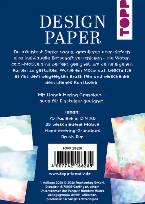 Du möchtest Danke sagen, gratulieren oder einfach eine individuelle Botschaft verschicken? Dann ist dieser Design Paper-Block im Watercolor-Design genau das Richtige für dich! Die 25 liebevoll gestalteten Watercolor-Motive eignen sich perfekt, um deine eigenen Karten zu gestalten. Wähle ein Motiv aus, beschrifte es mit dem beigefügten schwarzen Brush Pen und verschenke eine persönliche, kreative Karte.
