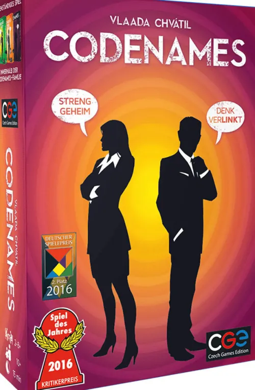 Das Spiel des Jahres 2016!Das spannende Knobelspiel für clevere Agententeams.Jedes Team muss bestimmte Wörter finden, da sich hinter diesen Codenamen die Agenten ihrer Farbe verbergen. Nur die jeweiligen Geheimdienstchefs jedes Teams kennen die gesuchten Wörter und müssen ihr Team mit schlauen Hinweisen auf die richtige Spur bringen. Dabei dürfen sie aber nur wenig verraten. Das Team, das zuerst alle seine Agenten findet, gewinnt.Codenames, das als Spiel des Jahres 2016 ausgezeichnet wurde, bietet kleinen und große Gruppen Spielspaß mit cleverem um die Ecke-Denken.Spielmaterial:265 Karten1 Kartenhalter1 Sanduhr1 Spielregel