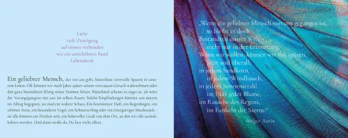 „Wenn ein geliebter Mensch von uns gegangen ist, so bleibt er doch Bestandteil unserer Welt – nicht nur in der Erinnerung. Wenn wir wollen, können wir ihn spüren, jetzt und überall: in jedem Sandkorn, in jedem Windhauch, in jedem Sonnenstrahl, im Duft jeder Blume, im Rauschen des Regens, im Funkeln der Sterne.“ (Holger Aurin)