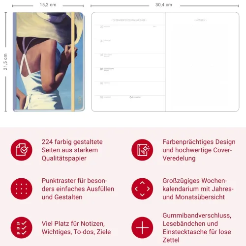 – Für mehr Sommer zu jeder Jahreszeit: Edler Taschenkalender 2026 mit einem eleganten Kunstwerk von T. S. Harris auf dem Cover- Terminkalender im DIN A5-Format für den stilvollen Überblick: Wochenübersicht mit viel Raum für Notizen und Extraseiten für Organisatorisches- Summer Vibes für die Handtasche: farbenfrohes Cover mit SoftTouch-Einband im Format 15, 2 x 21, 5 cm- Alle Termine und wichtigen To-dos im Griff: Chefplaner mit tollen Extras wie Lesebändchen, Froschtasche und Leinenrücken- Schönes Design und hochwertige Ausstattung: Die Terminplaner von Heye im Athesia Kalenderverlag