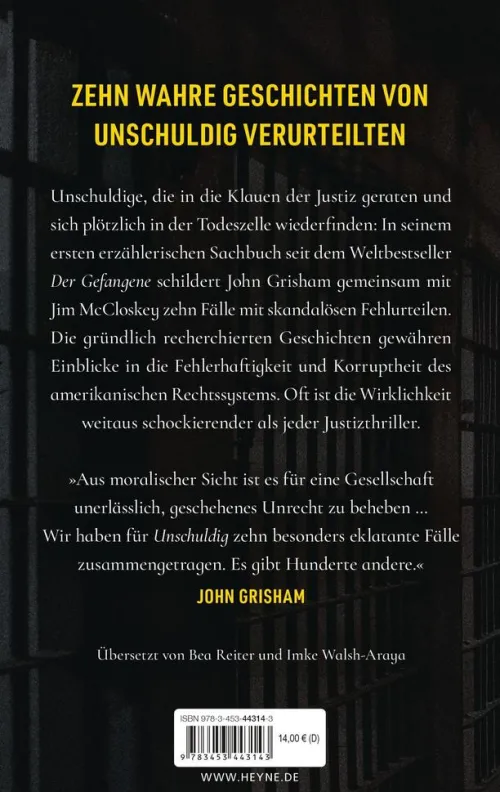 Unschuldige, die in die Klauen der Justiz geraten und sich plötzlich in der Todeszelle wiederfinden: In seinem ersten erzählerischen Sachbuch nach dem Weltbestseller »Der Gefangene« schildert John Grisham gemeinsam mit dem Gründer von Centurion Ministries, Jim McCloskey, zehn wahre Fälle skandalöser Verurteilungen. Perfekt recherchiert und packend geschrieben, gewähren die unglaublichen Geschichten einen erschütternden Einblick in die Fehlerhaftigkeit des amerikanischen Justizsystems. John Grisham at his best!