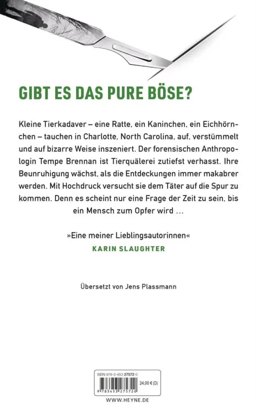 Kleine Tierkadaver – eine Ratte, ein Kaninchen, ein Eichhörnchen – tauchen in Charlotte, North Carolina, auf, verstümmelt und auf bizarre Weise inszeniert. Der forensischen Anthropologin Tempe Brennan ist Tierquälerei zutiefst verhasst. Ihre Beunruhigung wächst, als die Entdeckungen immer makabrer werden. Mit Hochdruck versucht sie dem Täter auf die Spur zu kommen. Denn es scheint nur eine Frage der Zeit zu sein, bis ein Mensch zum Opfer wird . . .