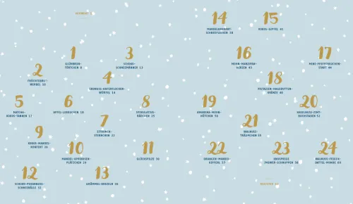 Schoko-Schneemänner, Zitronensternchen oder Apfel-Lebkuchen 24 himmlische Naschereien versüßen uns die Zeit bis Weihnachten und erfüllen die Küche mit wunderbarem Plätzchenduft. Zarte Kokosflocken umhüllen köstliches Konfekt und schneeweißer Zuckerguss verziert die Leckereien: ein Wintertraum auf dem Plätzchenteller!