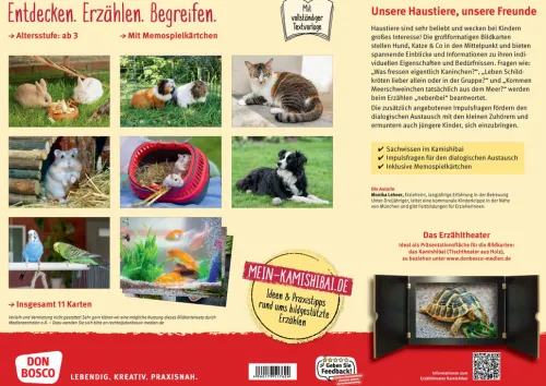 Das Erzähltheater eignet sich mit seinem spielerischen Ansatz zu Wissensvermittlung und Sprachförderung perfekt für den Einsatz in Krippe, Kita und Grundschule. Der aufstellbare Rahmen, in den die einzelnen Bildkarten hineingestellt und während des Vortrags nacheinander herausgezogen werden, ermöglicht eine lebendige Präsentation von Sachwissen. Die kurzen Sachtexte zu jedem Haustier informieren über die unterschiedlichen Haltungsanforderungen und laden zu weiterführenden Unterhaltungen über Mensch-Tier-Beziehungen ein. So kann jedes Kind von seinen eigenen Erfahrungen mit Hund, Wellensittich und Co berichten!