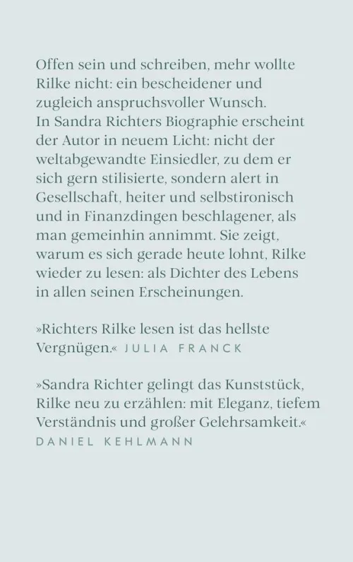 Sandra Richter, Literaturwissenschaftlerin und Direktorin des Deutschen Literaturarchivs Marbach, arbeitet mit neuen Quellen, die mit Ankauf des großen Rilke-Archivs 2022 nach Marbach gelangt sind. In ihrer Biographie erscheint der Autor in neuem Licht: Nicht der weltabgewandte Einsiedler, zu dem er sich gern stilisierte, sondern robust, durchsetzungsfähig, alert in Gesellschaft, heiter und selbstironisch und in Finanzdingen beschlagener, als man gemeinhin annimmt. Diese Biographie macht deutlich, warum es sich heute in besonderer Weise lohnt, Rilke wieder zu lesen: Er lebte in schwierigen Zeiten, und er verarbeitete sie mit einer Wucht, die vielleicht nur im Angesicht existenzieller Bedrohung glaubhaft wirkt.