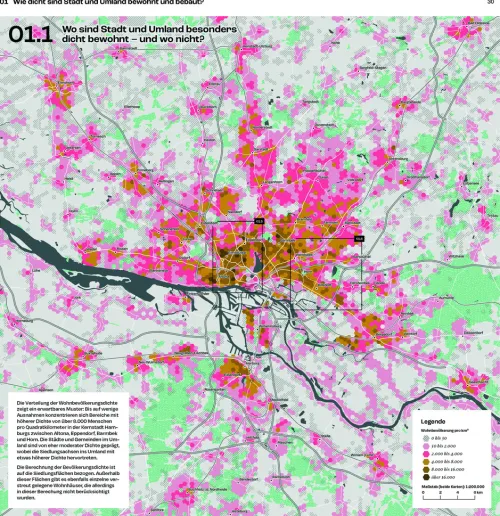 Als wachsende Metropole muss Hamburg zukunftsfähige Lösungen für die drängenden Fragen der Stadtentwicklung finden. Klimaschutz, Mobilitätswende, Bevölkerungswachstum und bezahlbarer Wohnraum sind jedoch Herausforderungen, die über Landesgrenzen hinaus wirken. Mit dem Stadt-Umland-Atlas Hamburg legt die Hamburger Behörde für Stadtentwicklung und Wohnen einen Grundstein für einen neuen Blick auf Hamburg und die Region: Umfangreiche Datenerhebungen erfassen Muster und Potenziale, die sich aus den Verflechtungen zwischen Stadt und Umland ergeben. Visuell aufbereitet in über 250 Karten schaffen diese einen umfassenden Überblick für die Planung und Gestaltung zukünftiger räumlicher Strukturen in der Hansestadt und darüber hinaus.