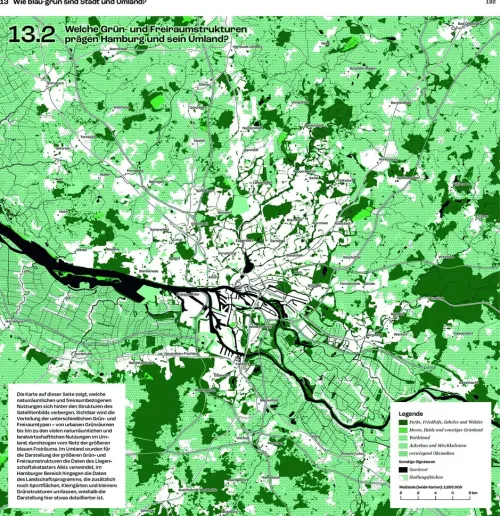 As a growing metropolis, Hamburg must develop sustainable solutions to urgent issues in urban development. But climate action, the mobility transition, population growth, and affordable housing are challenges that transcend the city’s boundaries. With the Stadt-Umland-Atlas Hamburg (Atlas of Hamburg and environs), the Hamburg Ministry of Urban Development and Housing lays the groundwork for a new vision of Hamburg and the region: extensive data surveys capture patterns and potentials that emerge from the interweaving of the city and its surroundings. Translated into more than 250 maps, the atlas provides a comprehensive overview of the planning and design of future spatial structures in the Hanseatic city and beyond.