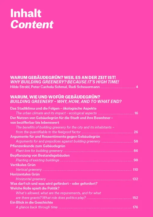 Das Handbuch zum Gebäudegrün in seiner dritten erweiterten Auflage richtet sich an die Bürgerschaft ebenso wie an Architekt*innen und Bauherr*innen. Es liefert Antworten auf die am häufigsten gestellten Fragen – von der Bestands- bis zur Neubaubegrünung, von finanziellen Förderungen und praktischen Tipps zur Pflanzenwahl bis zu ökologischen Auswirkungen auf das Stadtklima. Es ist an der Zeit – und viele Beispiele in Deutschland und weltweit zeigen, dass Grünbauten möglich und wachsende Realität sind.