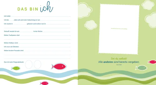 Das Album zur Erinnerung an die Erstkommunion: Wann war die Feier, wer war da, was wünschten die Gäste und wie war der Tag? Diese und weitere Erinnerungen plus viele Fotos vom Fest können hier festgehalten, eingetragen und eingeklebt werden.