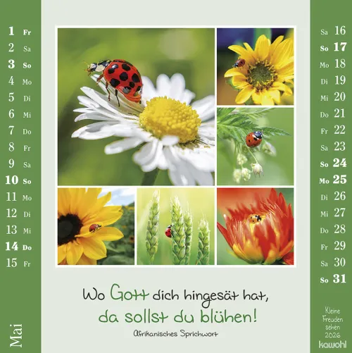 Stimmungsvolle BildcollagenAuf den Blickwinkel kommt es an, um im Alltäglichen die kleinen Freuden zu entdecken. Facettenreiche Bilder, charmant komponiert zu einer Einheit, schmeicheln Ihren Sinnen. Herzliche Sinnsprüche und christliche Zitate unterstreichen die Mut machende Wirkung. Postkarten-Kalender 16 x 16 cm14 Blätter, Postkartenkarton, Spiralbindung, Aufsteller.