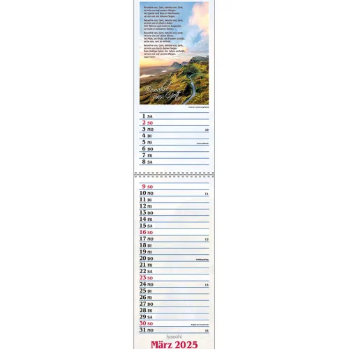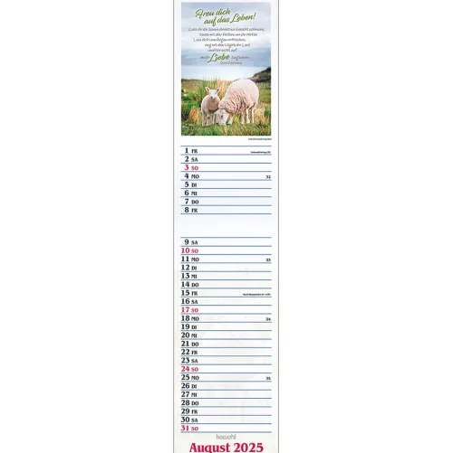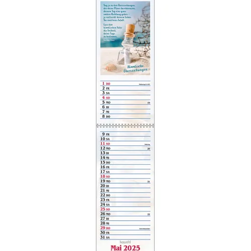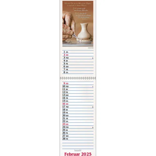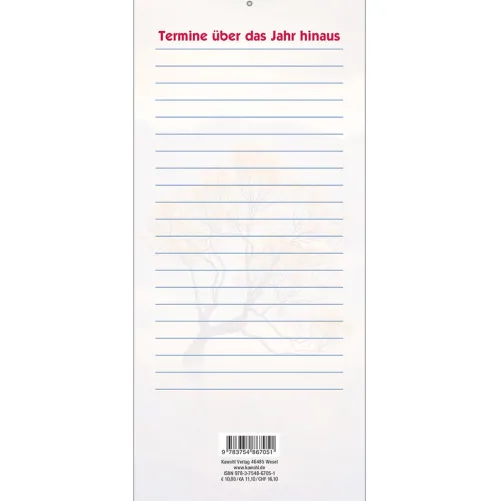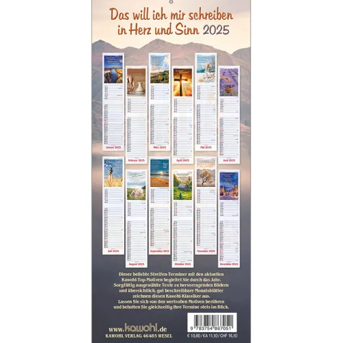Terminer – gute Gedankenstützen für Ihr ZuhauseDieser Terminer ist aufwändig gestaltet, mit leicht gesoftetem, gut beschreibbarem Untergrund, den beliebten Kawohl-Postermotiven und christlichen Texten. DOUBLE-SIZE-Terminer:- Streifenkalender, 14 x 31 cm (aufgeklappt 62 cm)- mit christlichen Texten und Bibelversen- mit aussagestarken Fotos- beschreibbarer Karton