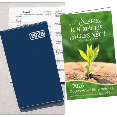 PRAKTISCH UND BELIEBT – bereits seit über 40 Jahren im Kawohl-SortimentTerminkalender & Tägliche BibelworteDer bewährte kompakte Begleiter im Pocket-Format. Mit Leporello-Kalendarium (eine Woche auf einer Seite), Telefonregister und dem Heftchen „Gottes Wort für jeden Tag“ (mit ausgelosten Bibelworten, Plan der täglichen Bibellese, Platz für Notizen.)Taschen-Terminer 9 x 15 cmin dunkelblauer Kunststoff-HülleGott spricht: Siehe, ich mache alles neu! Offenbarung 21, 5 (Jahreslosung 2026)