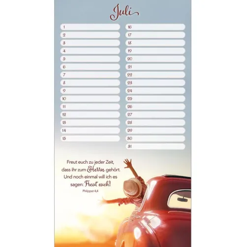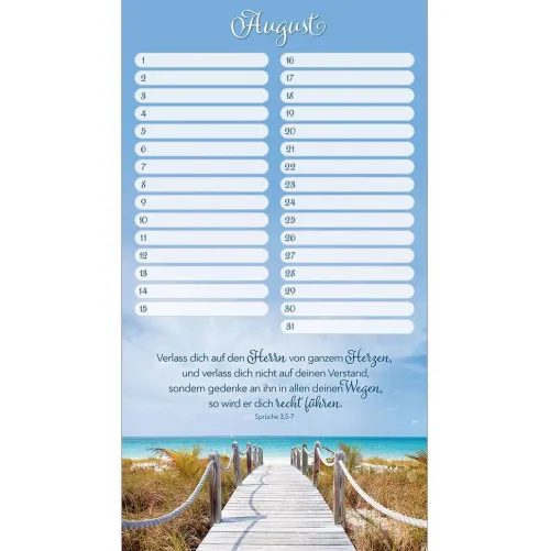 Mit diesem wunderschönen Wandkalender vergessen Sie nie wieder Geburts- und Jahrestage. Stimmungsvolle Bilder mit wertvollen Bibelversen begleiten Sie jedes Jahr aufs Neue und sind im praktischen Hochformat ein echter Blickfang. Zusätzlich gibt es genügend Spalten um alle Geburts-, Fest- oder Trauertage von Freunden und Verwandten einzutragen. Dieser Kalender ist somit nicht nur praktisch, sondern auch sehr dekorativ und ermutigend. Ein wertvoller Begleiter für viele Jahre.