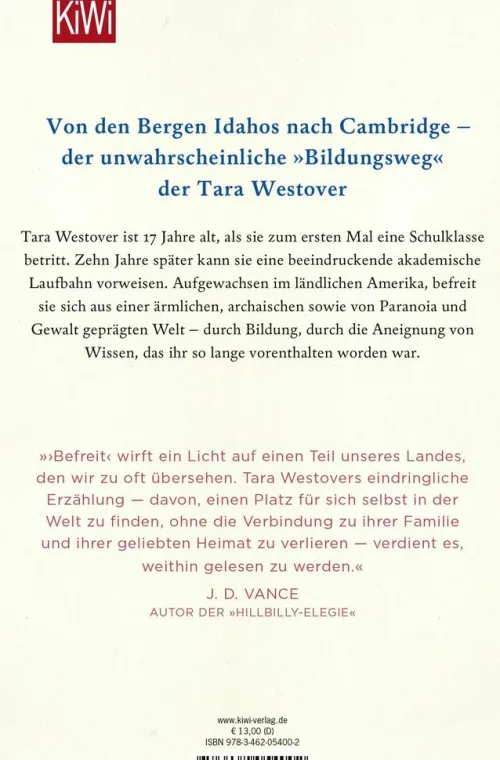 Tara Westover ist 17 Jahre alt, als sie zum ersten Mal eine Schulklasse betritt. Zehn Jahre später kann sie eine beeindruckende akademische Laufbahn vorweisen. Aufgewachsen im ländlichen Amerika, befreit sie sich aus einer ärmlichen, archaischen und von Paranoia und Gewalt geprägten Welt durch – Bildung, durch die Aneignung von Wissen, das ihr so lange vorenthalten worden war.