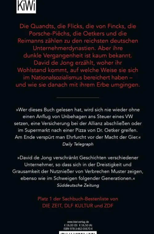 Nach der Machtübernahme der Nationalsozialisten traten viele Unternehmer in die Partei ein und arbeiteten mit dem Regime zusammen. Sie verdienten an der Aufrüstung und bereicherten sich durch Einsatz von Zwangsarbeitern und Raub jüdischer Unternehmen in Deutschland und in den besetzten Gebieten Europas. David de Jong erzählt auf fesselnde Weise von einem Jahrhundert deutscher Geschichte – und von Dynastien, deren Entscheidungen viele Schicksale bestimmt haben und die bis heute den Alltag von Menschen in Deutschland und der Welt beeinflussen.