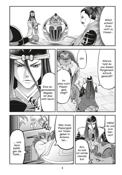 Und unser kleiner blauer Knuddel-Alien macht was? ! Stitch latscht einfach aus den Trümmern seines Raumschiffes und fletscht die Zähne. Müde vom endlosen Kampf verfällt der Samurai in diesem Moment dem blauen Alien und beschließt, mit ihm im Gepäck nach Hause zu ziehen. Ob das so eine gute Idee ist . . . ?