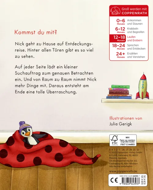 Kommst du mit? Nick geht zu Hause auf Entdeckungsreise. Hinter all den großen Türen gibt es so viel zu sehen! Auf jeder Seite lädt ein kleiner Suchauftrag zum genauen Betrachten ein. Und von Raum zu Raum nimmt Nick mehr Dinge mit. Daraus entsteht auf der letzten Seite eine tolle Überraschung!