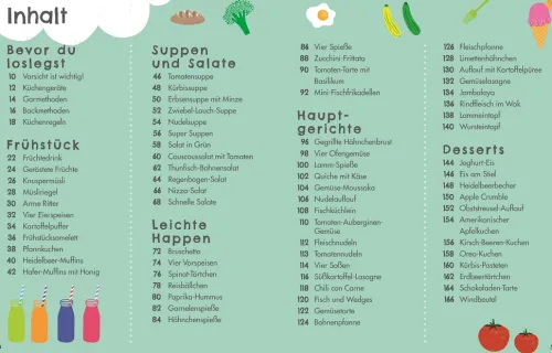 – Wichtige Grundlagen kindgerecht erklärt: Eine bebilderte Übersicht der wichtigsten Küchengeräte und Zutaten sowie typische Kochmethoden helfen beim Aufbau erster Kochfähigkeiten