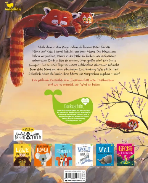 Hoch oben in den Bergen leben die kleinen Roten Pandas Nima und Ketu, liebevoll behütet von ihrer Mama. Die Schwestern haben versprochen, immer in der Nähe zu bleiben und aufeinander aufzupassen. Doch je älter sie werden, umso größer wird auch Ketus Neugier, bis sie eines Tages zu einem gefährlichen Abenteuer aufbricht. Nun steht Nima vor einer schwierigen Entscheidung: Was soll sie tun? Schließlich haben die beiden ihrer Mama ein Versprechen gegeben