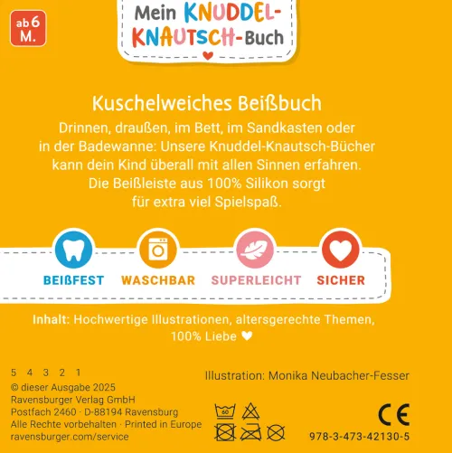 Mein Knuddel-Knautsch-Buch ist ein superstarkes Stoffbuch für jede Gelegenheit! Es ist besonders robust und lässt sich weder zerreißen noch zerbeißen. Trotzdem ist es kuschelweich und federleicht, sodass es auch für Kinder ab Geburt bereits gut greifbar ist. Die bunten Bücher laden dazu ein, erste Geschichten mit allen Sinnen zu entdecken. Waschbar bei 60°C wird dieses Buch zu einem langlebigen Begleiter für kleine Leseratten. Mit der praktischen Schlaufe wird es schnell am Hochstuhl, Laufstall oder Kinderwagen befestigt.