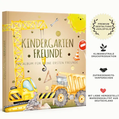 Ein ganz besonderes Freundebuch für begeisterte Baustellenfreunde und ihre ersten Begleiter und Begleiterinnen im Kindergarten. Spannende Themen führen durch ein wundervolles Freundealbum, in dem jeder auf besondere Weise eingeladen wird, sich zu verewigen damit die ersten Freundschaften im Leben nicht vergessen werden und später wieder aufleben können. Auf besonders schön gestalteten Seiten kann man reichlich Fragen beantworten, ankreuzen, ausmalen und mitmachen um auf natürliche Weise die soziale Bindung und persönliche Kreativität zu fördern. Damit das Freundschaftsbuch auch lange Freude bereitet, sind die Seiten besonders stabil und der Einband des Buches fest und folienkaschiert. Und für das gewisse Etwas gibt es eine wunderschöne Goldfolienprägung auf dem Cover des Buches, so kann jeder erkennen dass es sich um ein einzigartiges, persönliches Erinnerungsstück handelt. Ein besonderes Geschenk für die Zeit im Kindergarten und die ersten Geburtstage mit Freunden!