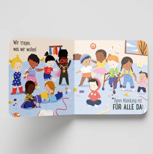„Kleidung ist für alle da“ lädt Kinder ein, sich unabhängig von ihrem Geschlecht frei zu entfalten – egal mit welchen Anziehsachen. Sanft und altersgerecht brechen die bunten Doppelseiten mit tradierten Geschlechterklischees und zeigen uns, dass Kinder vor allem eins sein sollten: sie selbst.