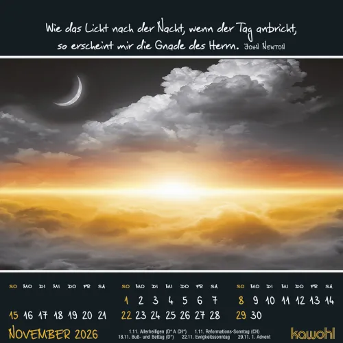 SCHWARZ + BUNT = attraktivEntdecken Sie Tag für Tag kleine Wunder und erfreuen Sie sich an den farbenfrohen Bildelementen, die sich aus den modernen Schwarz-Weiß-Fotos hervorheben. Christliche Zitate, bemerkenswerte Sinnsprüche und prägnante Bibelverse unterstreichen die kunstvolle Bildersprache. Postkarten-Kalender 16 x 16 cm14 Blätter, Postkartenkarton, Spiralbindung, Aufsteller.