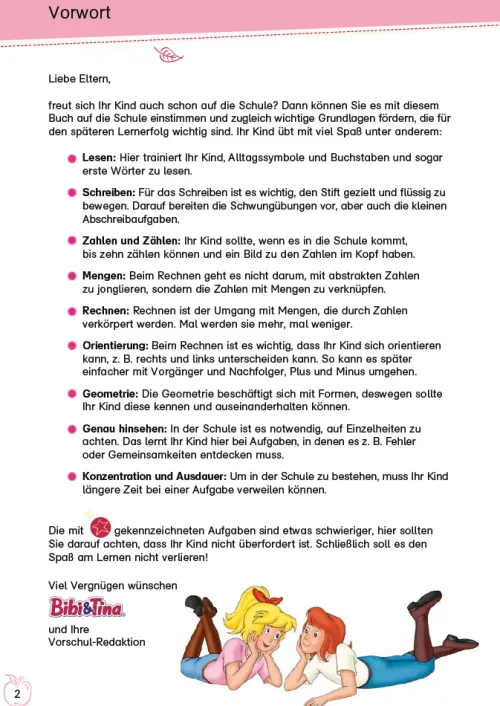 - Sattelfest werden in wichtigen Grundlagen: erstes Lesen, Schreiben, Rechnen, Farben, Formen und Konzentration