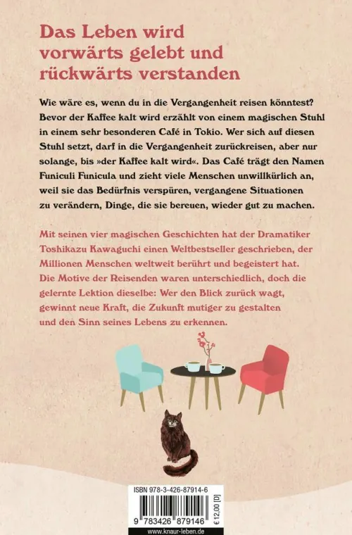 In einer kleinen Seitengasse in Tokio gibt es ein Café mit Namen Funiculi Funicula, das seit über hundert Jahren außergewöhnlich guten Kaffee serviert. Eine lokale Legende besagt, dass es noch etwas anderes als Kaffee anbietet: die Möglichkeit, in der Zeit zurückzureisen. Doch Zeitreisen sind nicht so einfach, und es gibt Regeln, die befolgt werden müssen. Am wichtigsten ist, dass die Reise nur so lange dauern kann, wie der Kaffee braucht, um kalt zu werden. Im Laufe eines Sommers besuchen vier Menschen das Café in der Hoffnung, diese Reise anzutreten. Sie möchten diese einmalige Gelegenheit nutzen, um Dinge abzuschließen und Trost zu finden. Ihre Motive sind unterschiedlich, doch die gelernte Lektion dieselbe: Egal ob Versöhnung, Vergebung oder neue Hoffnung – das Leben wird vorwärts gelebt und rückwärts verstanden.